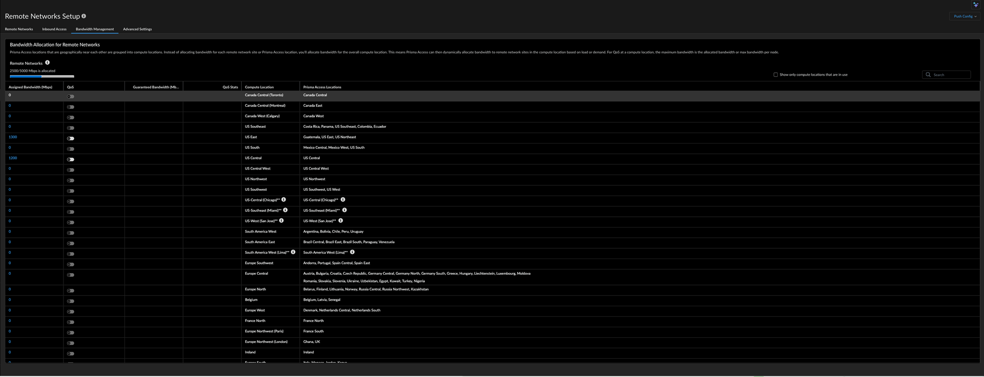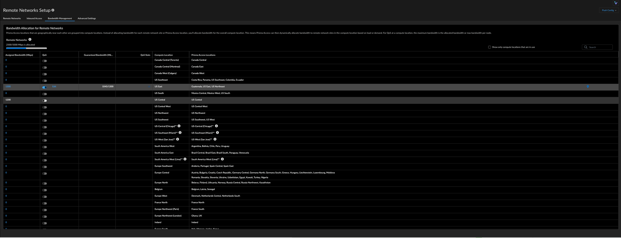 - Select ConfigurationNGFW and Prisma AccessRemote NetworksBandwidth Management.Determine the Prisma Access locations where you want to deploy QoS; then find the compute location that corresponds to each Prisma Access location.Each Prisma Access location is allocated bandwidth from its compute location, and you must know the name of the compute location for the locations where you want to allocate QoS.Enable QoS at a compute location level in the QoS column.Any changes in settings apply to all locations corresponding to this compute location.