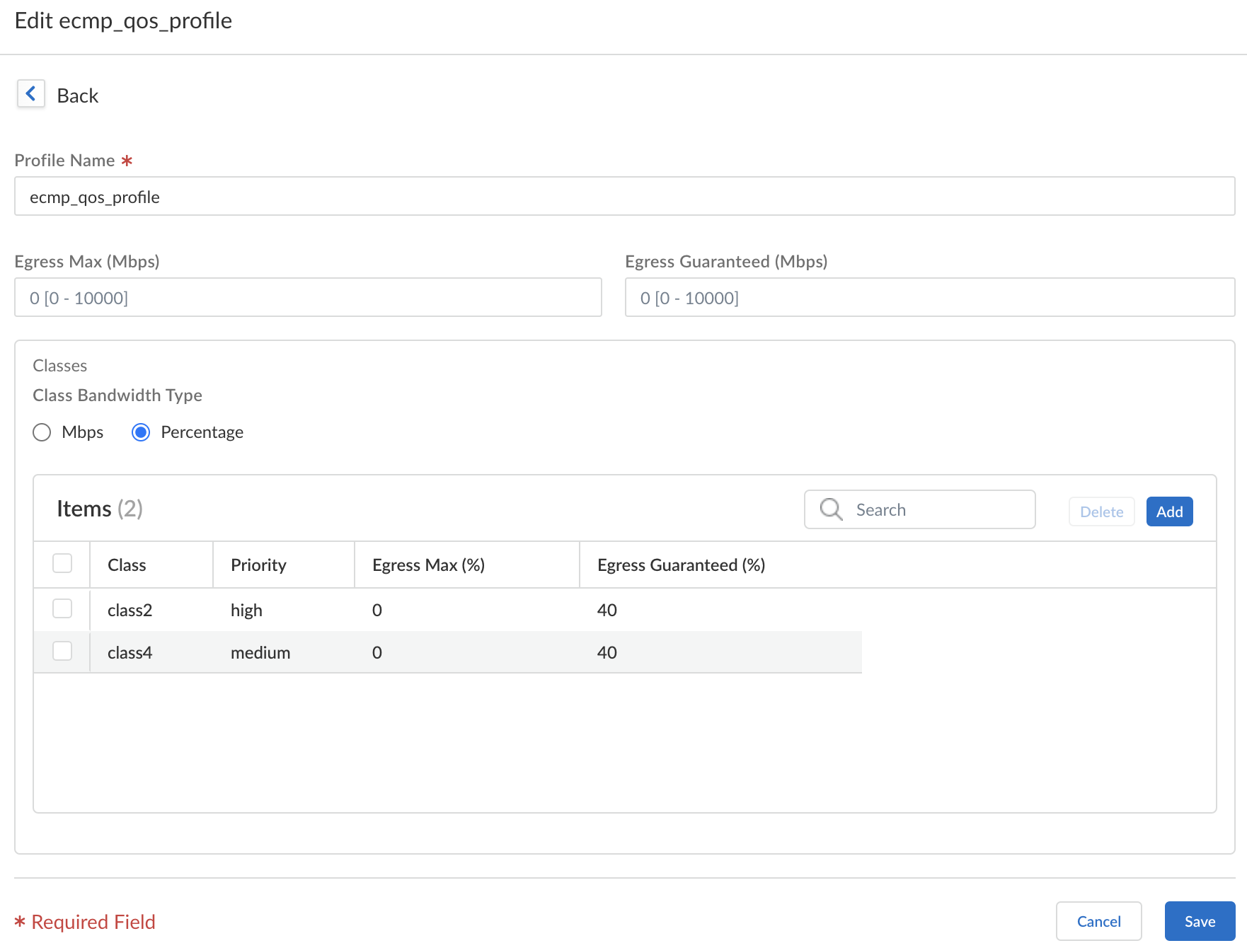 - ECMP: enabled sites allow customizations per ECMP link. You must tag the ECMP links where you want to apply the QoS customization.