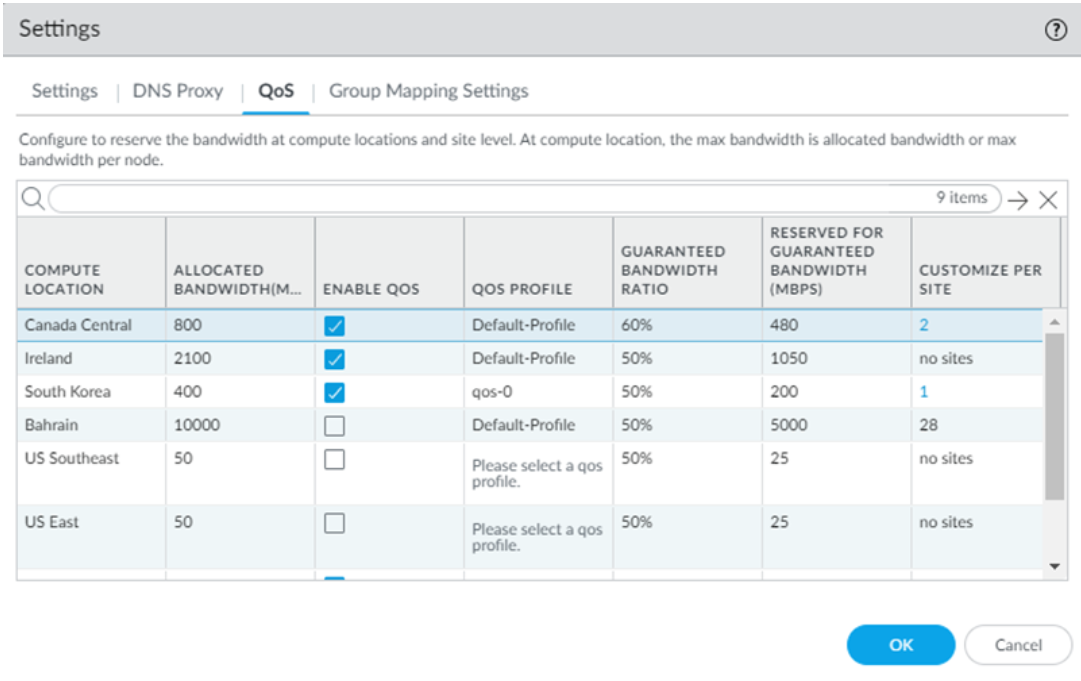 Click OKto save the changes.For Default QoS Profiles, enable QoS for your remote network locations that allocate bandwidth by compute location.- Determine the Prisma Access locations where you want to deploy QoS; then find the compute location that corresponds to each location.Each location is allocated bandwidth from its compute location, and you must know the name of the compute location for the locations where you want to allocate QoS. For a list of compute location-to-location mapping, see Prisma Access, or select PanoramaCloud ServicesConfigurationRemote NetworksAggregate Bandwidth and click the gear icon; the mappings display in the Compute Location and Prisma Access Location columns.Select PanoramaCloud ServicesConfigurationRemote NetworksSettings, click the gear to edit the settings, and select QoS.Enable QoS at a compute location level.Whatever settings you enter apply to all locations that correspond to this compute location.In the case of default QoS Profiles, you must enter the QoS Profile, and the Guaranteed Bandwidth Ratio.