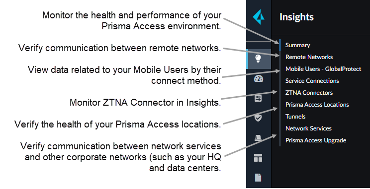 Prisma Access Insights allows you to monitor your Prisma Access environment and receive alert notifications for any issues.