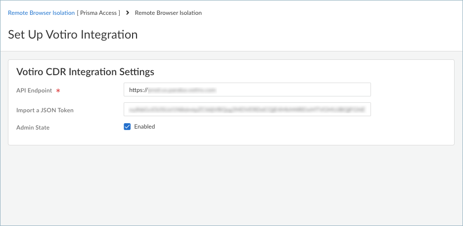 Enter the API Endpoint for Votiro. This is the site to which RBI will send files for analysis. You can obtain the API endpoint from the Votiro console.Enter the JSON Token that is used for authentication with Votiro. You can obtain the JSON token from the Service Tokens page in the Votiro console. Copy the JSON token and paste it in the JSON Token field in Strata Cloud Manager.Save your settings.Push Config to Prisma Access.The configuration has been completed and all files that a user downloads RBI will be sent to Votiro for CDR.If an isolation profile is configured to block file downloads, that action will override and block the file downloads before the files are sent to Votiro.