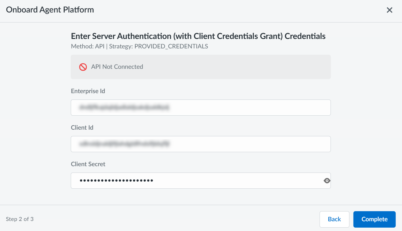 On the Onboard Agent Platform page, enter the following information (that you gathered in STEP 5 and STEP 14) and Complete.- Enterprise ID