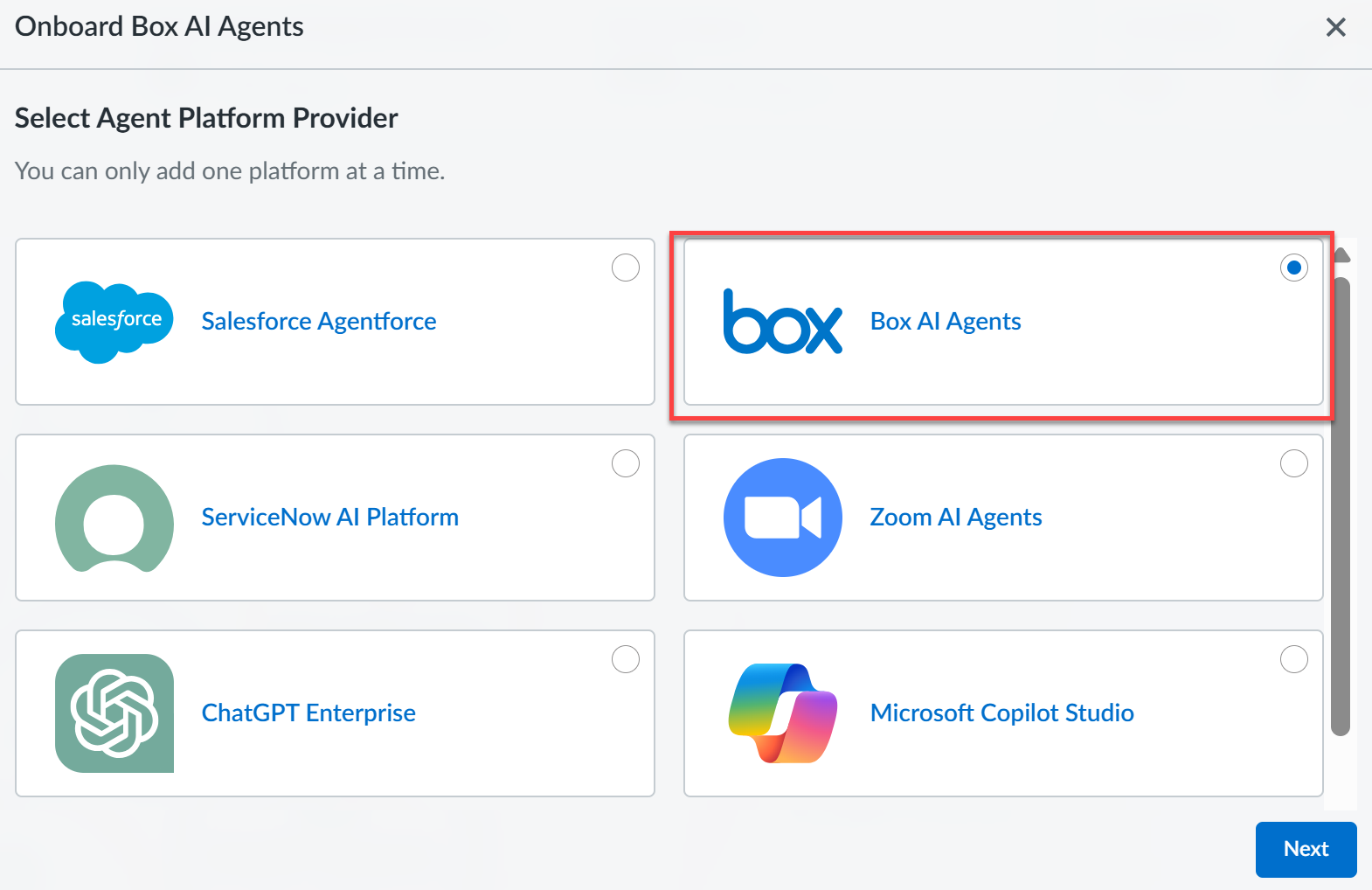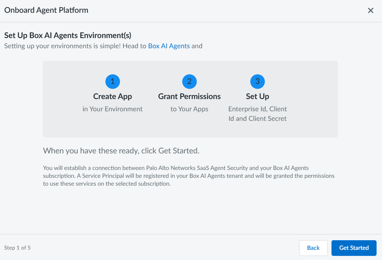 Ensure you repeat the authorization process again if you modify any settings during configuration.To start onboarding Box AI Agents to SaaS Agent Security, log in to Strata Cloud Manager.Select AI SecuritySaaS AgentsAgent Platform OnboardingOnboard Agent PlatformBox AI Agents.