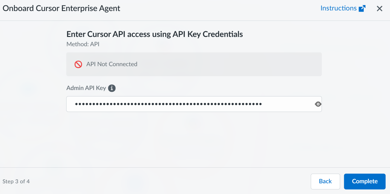 Copy the key and keep it handy for onboarding.To start onboarding Cursor Enterprise to SaaS Agent Security, log in to Strata Cloud Manager.Select AI SecuritySaaS AgentsAgent Platform OnboardingOnboard Agent PlatformCursor Enterprise.