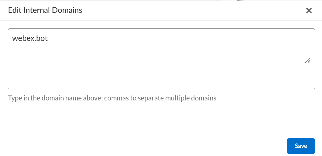 - Define Your Internal Domain When you add the Webex bot, Data Security automatically adds webex.bot to the list of internal domains to restrict the bot activity to the internal domain. Don't delete this entry from the list.