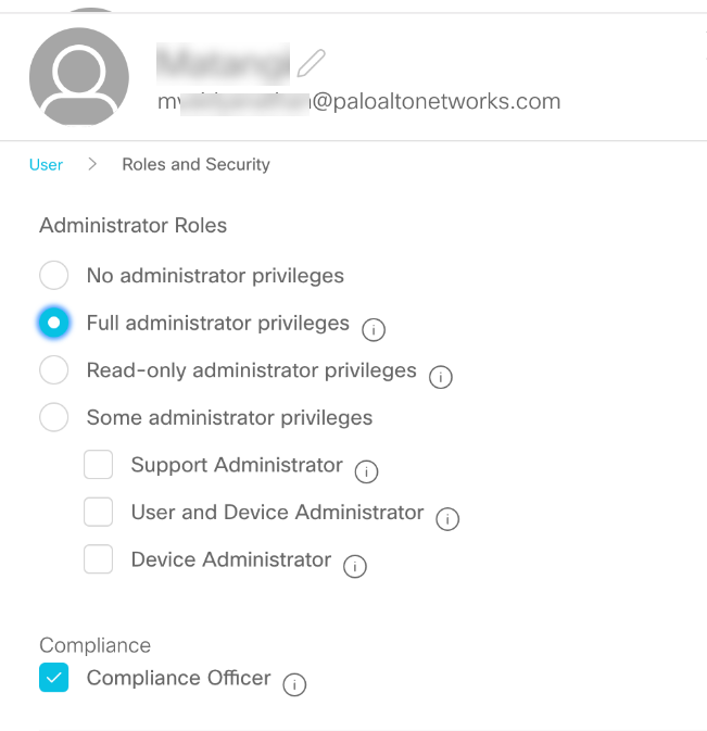 - Ensure that the Webex Teams account you plan to use with Data Security has sufficient privileges.To connect a Webex Teams instance to Data Security, you must use a Webex Teams account with administrator privileges.Log in to https://admin.webex.com, select ManagementUsersadmin_account_usernameRoles and Security.Enable Full administrator and Compliance Officer privileges.Ensure that you select the Compliance Officer role option. Otherwise, Data Security will not perform any scanning.Make sure to request another administrator to assign the Compliance Officer role to you, so your account has the correct privileges required to search for sensitive information in the Cisco Webex Teams app.