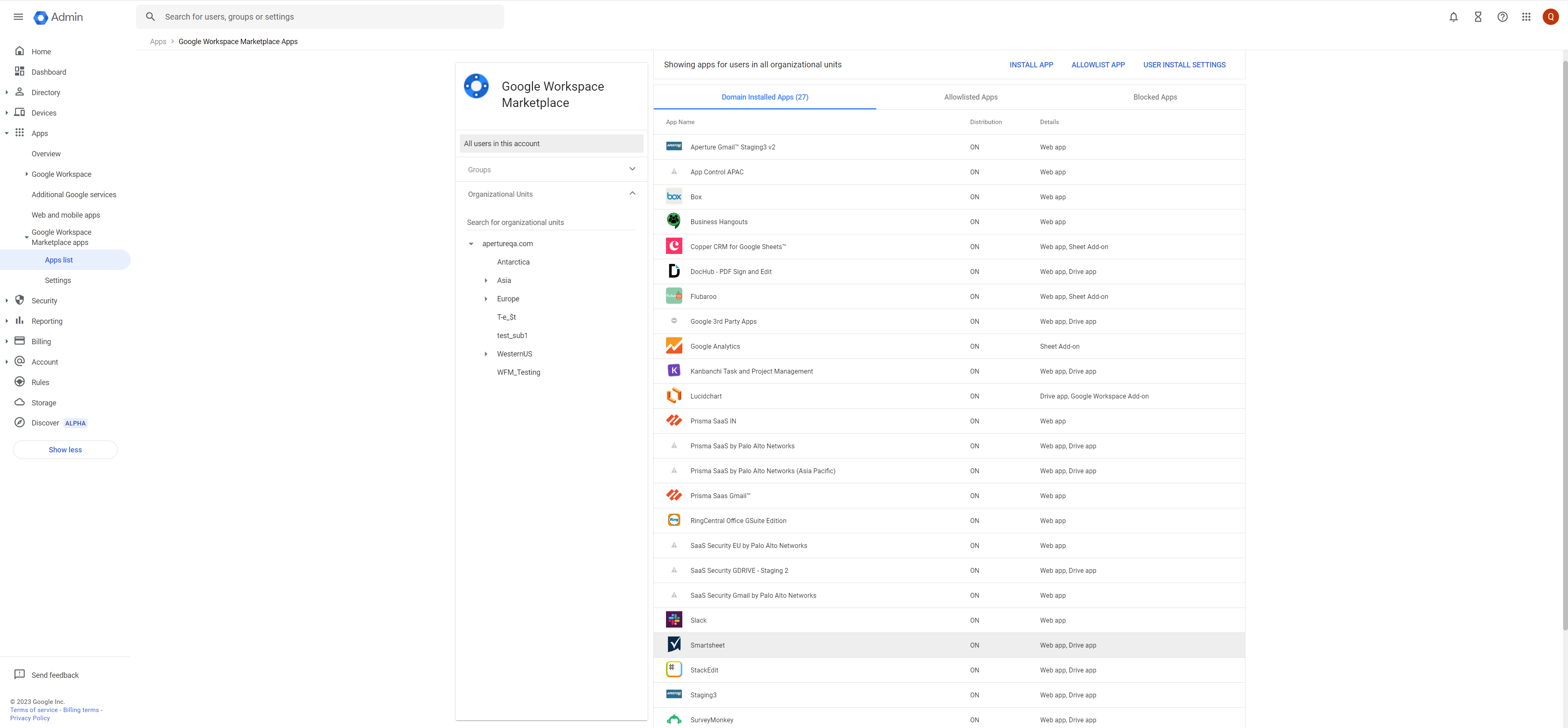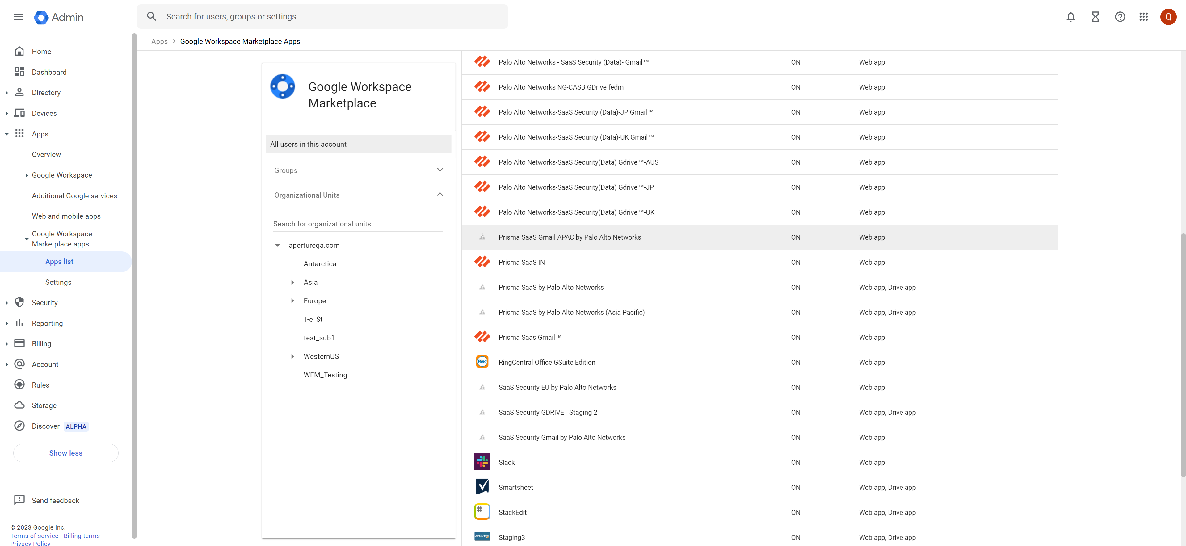 2. Go to the Google Admin Console and check if the Palo Alto Networks application is listed in the list of Google Workspace Marketplace Apps. Following are the app names for specific regions: