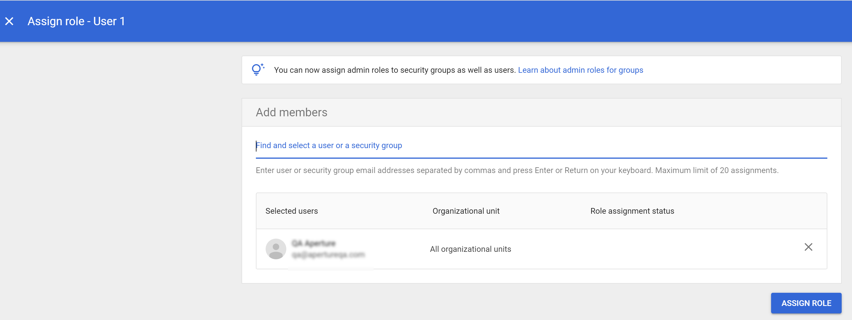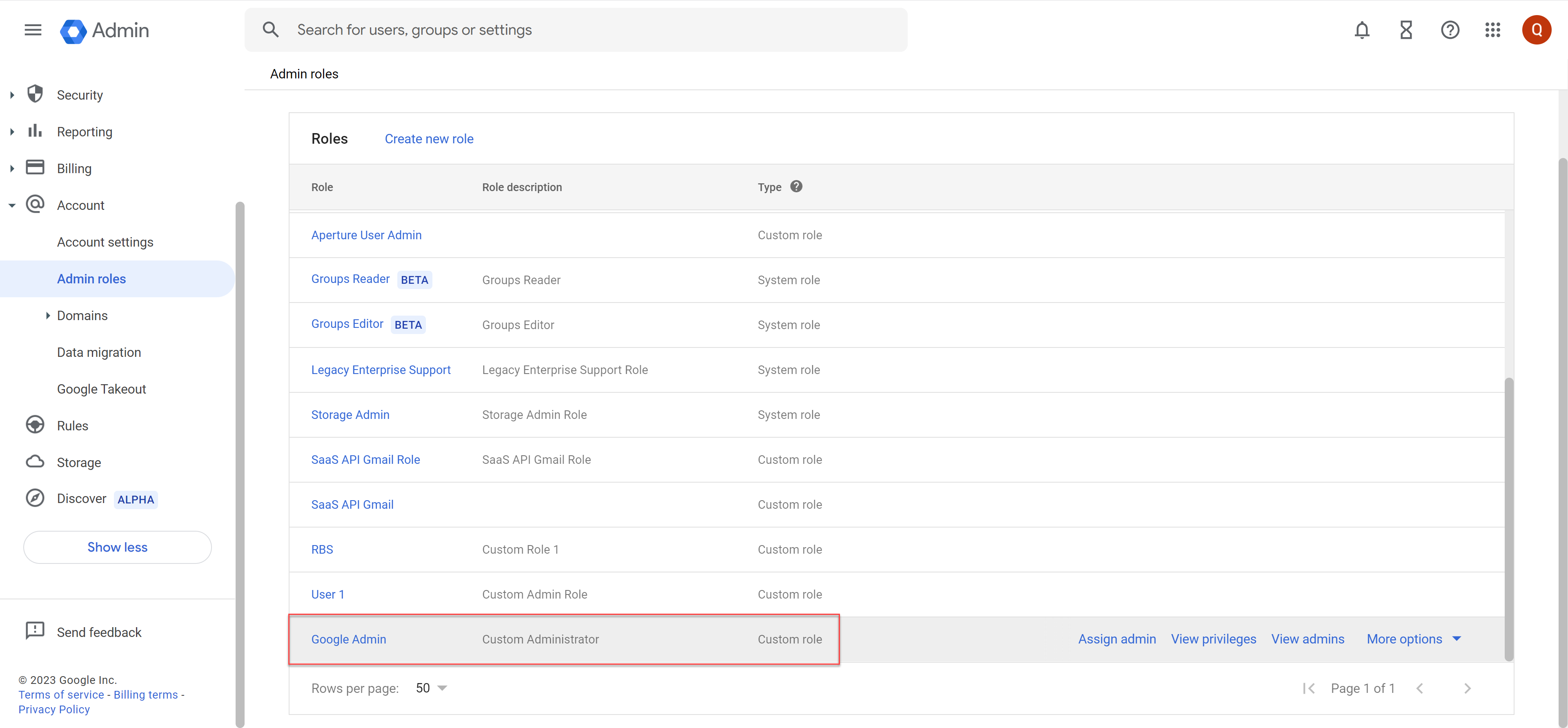 1. Verify that your Google administrator account is assigned as a custom admin role:
