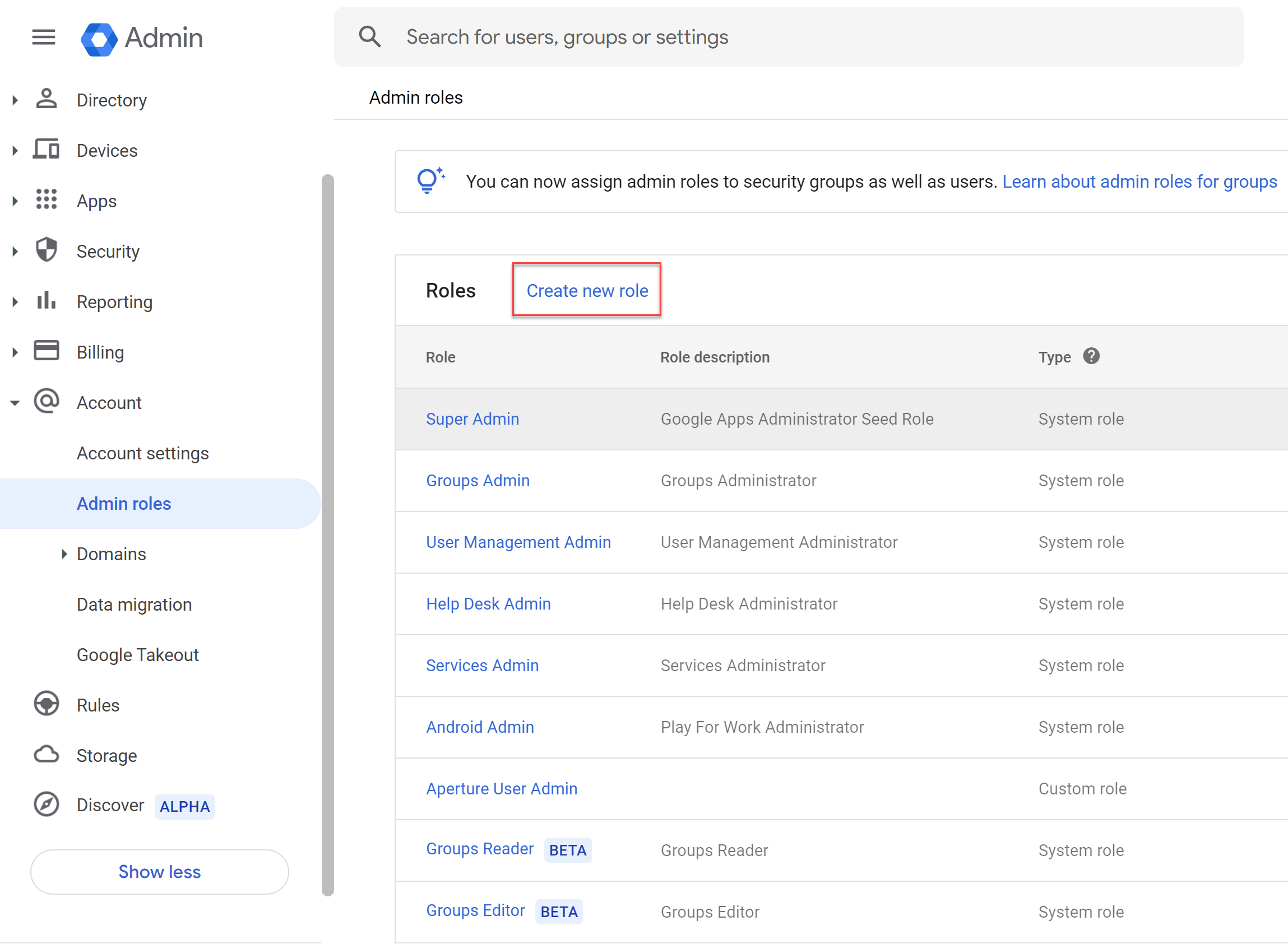 1. Go to the Google Admin Console and select AccountAdmin rolesCreate new role.