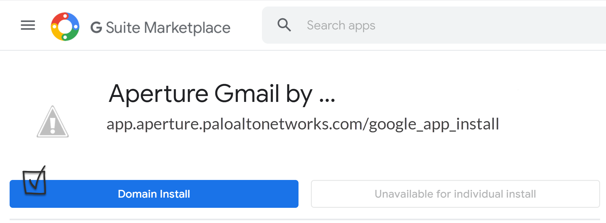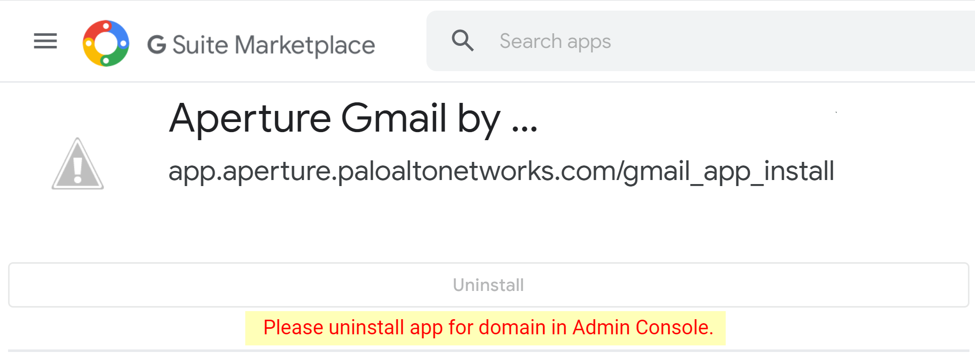4. Follow the onscreen instructions in Step 2: Go to Google Marketplace. Afterward, the Domain Install button is replaced by a disabled Uninstall button with a message that reads Please uninstall app for domain in Admin Console. This behavior is expected.