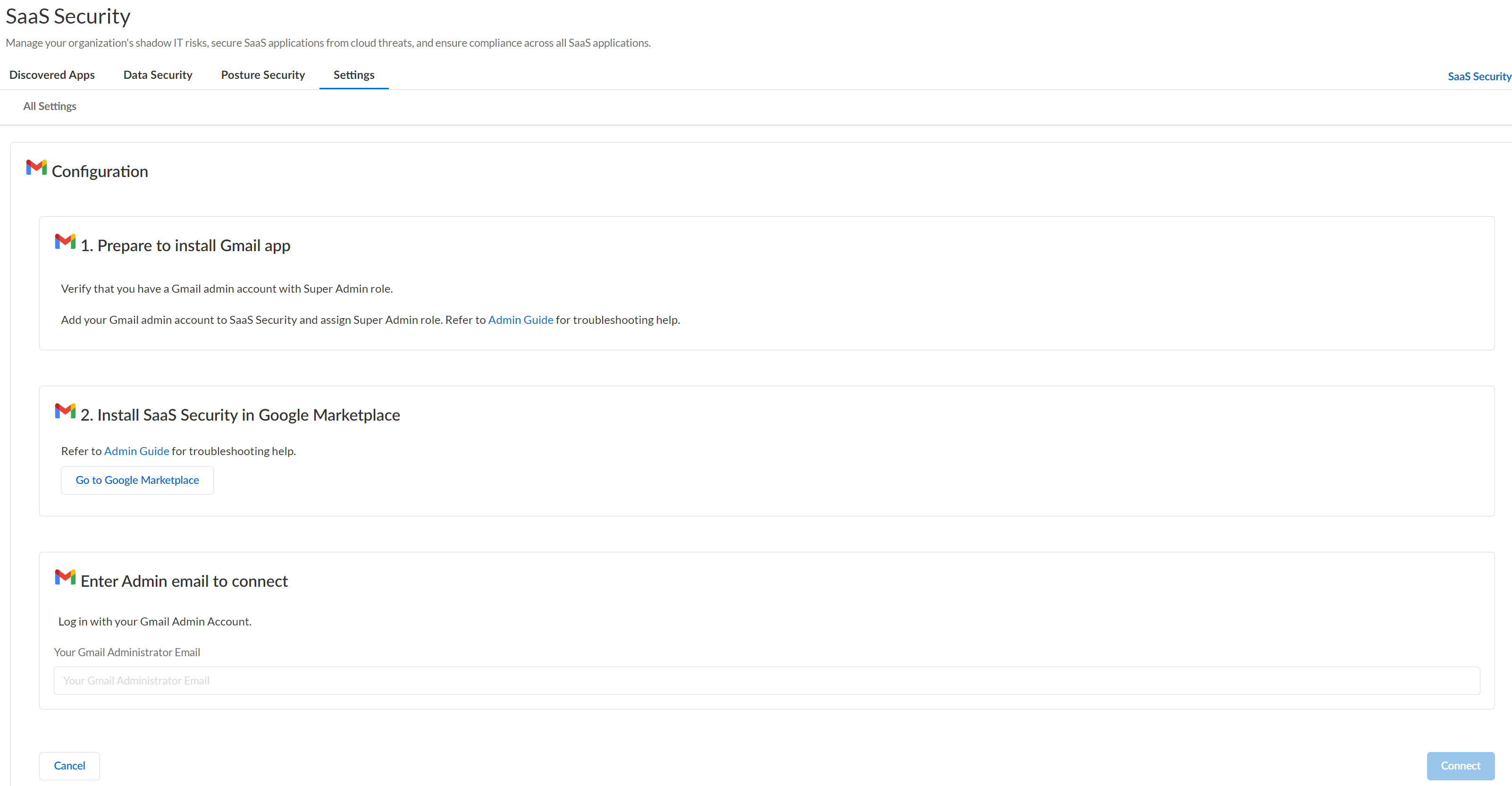 5. Add the same user email to the Gmail Administrator Email field in SaaS Security Gmail App onboarding UI and click Connect. For an existing instance of Gmail app, you can’t edit the email address in Strata Cloud Manager. So, edit it from the SaaS Security Console.