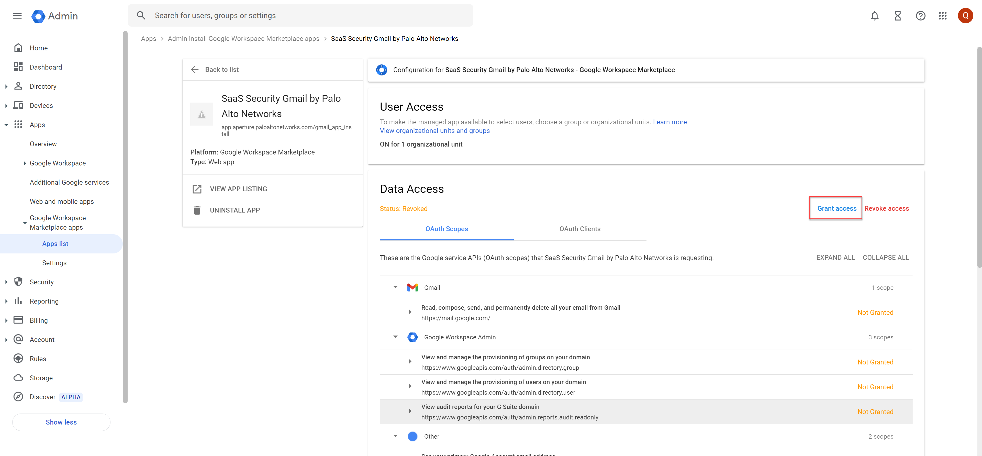 To grant access to the reduced privileges, from the Google Admin Console, select AppsGoogle Workspace marketplace appsApps List. Select the SaaS Security App from the list and click Grant Access.