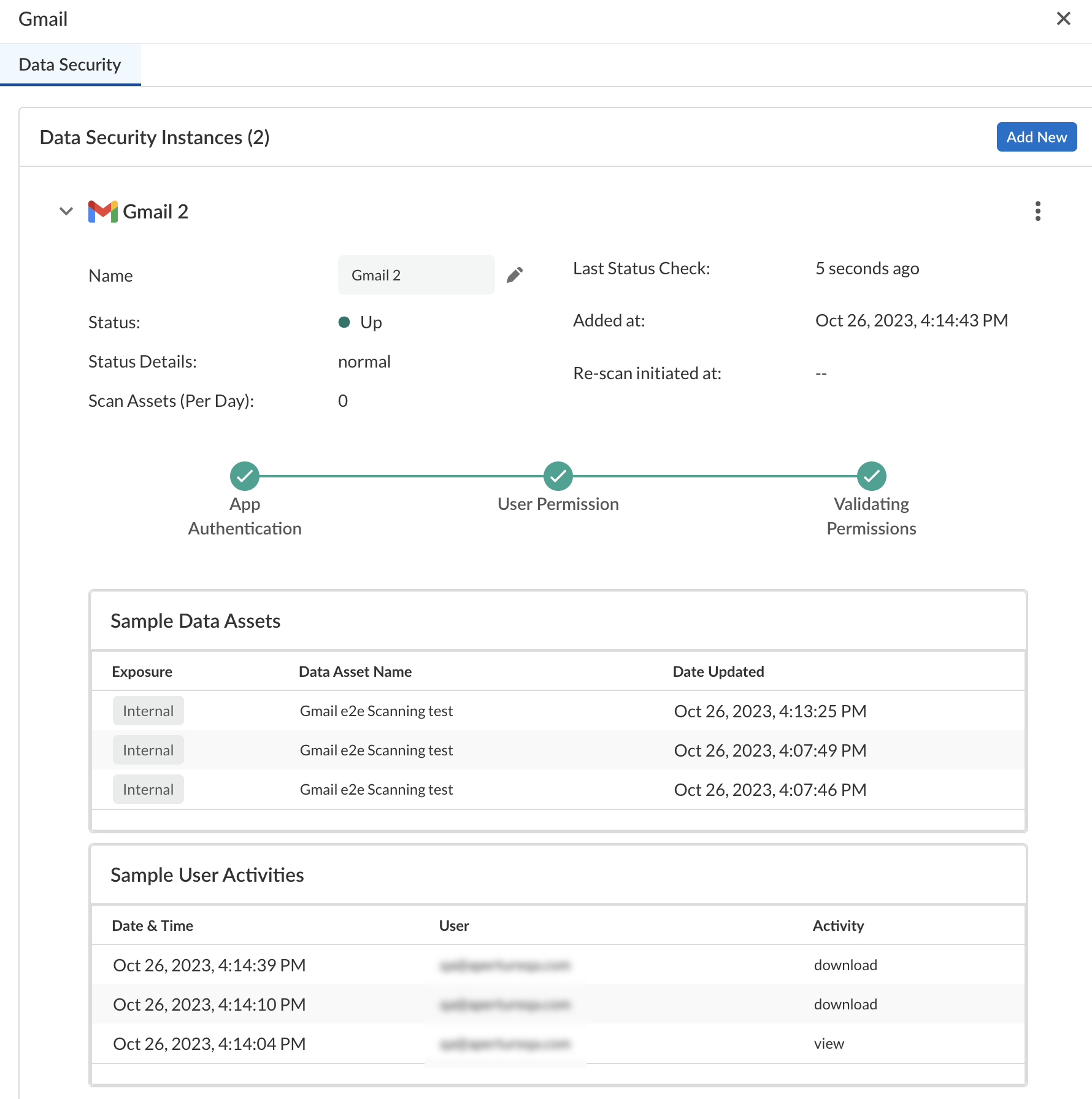 After the validation is successful, Data Security displays the sample data assets and sample user activities.