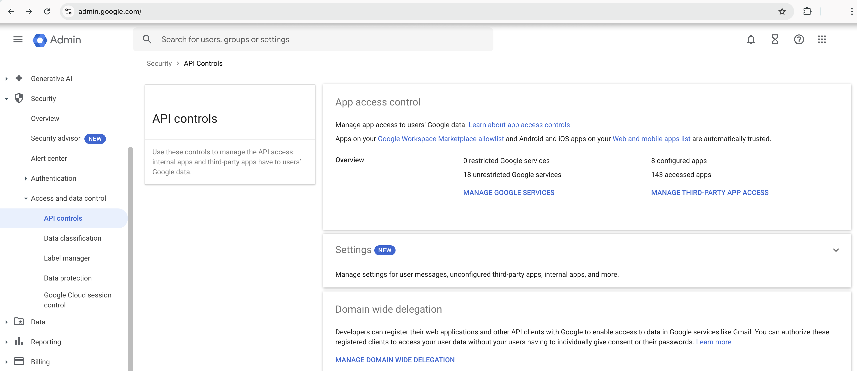 Select SecurityAccess and data controlAPI controls.Select MANAGE DOMAIN WIDE DELEGATION and add the required scopes and service account mentioned in Step 2 of the Google Chat app onboarding Configuration wizard.Add the same email address of the Google Chat administrator to Data Security and assign a Superuser role.