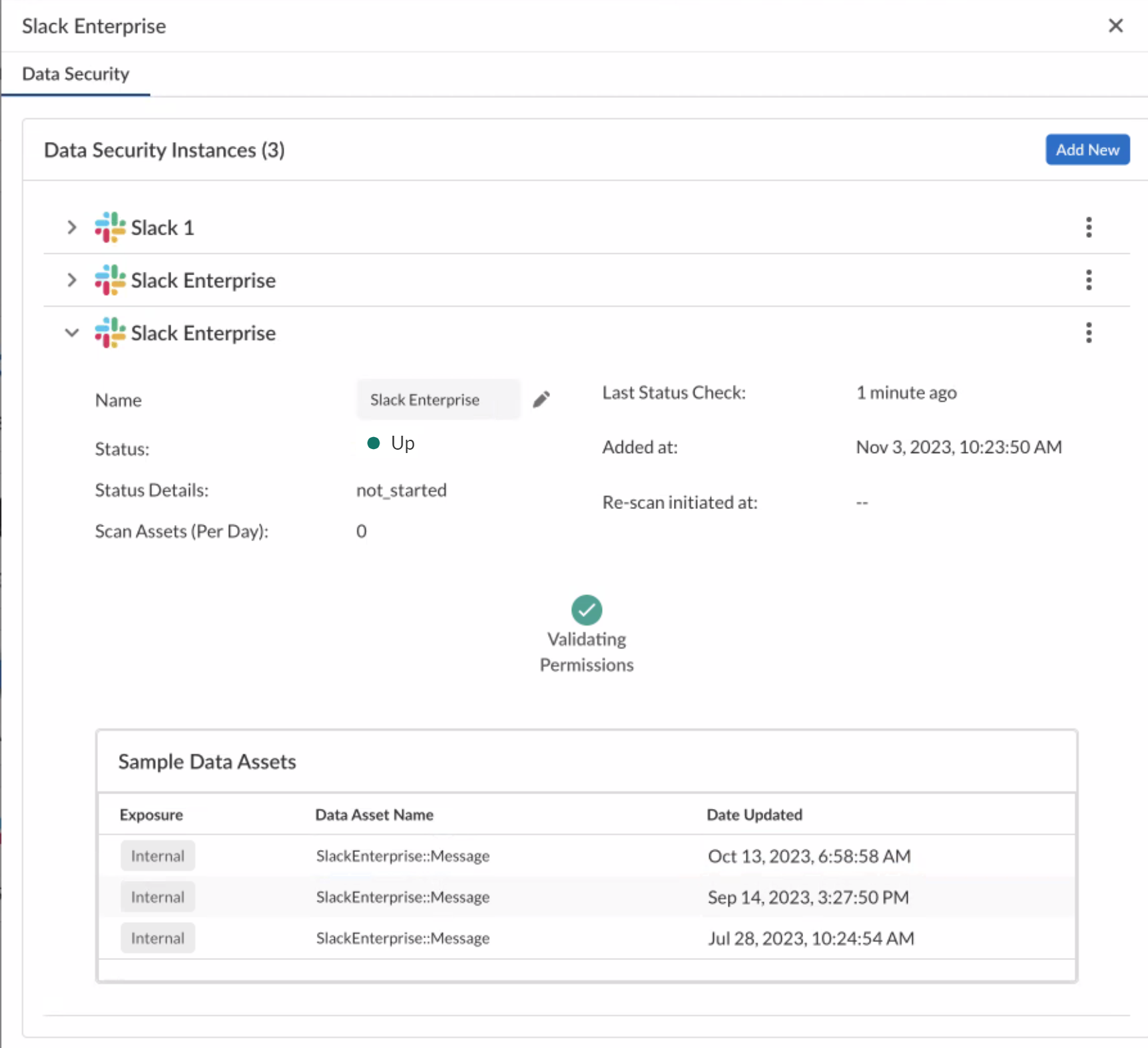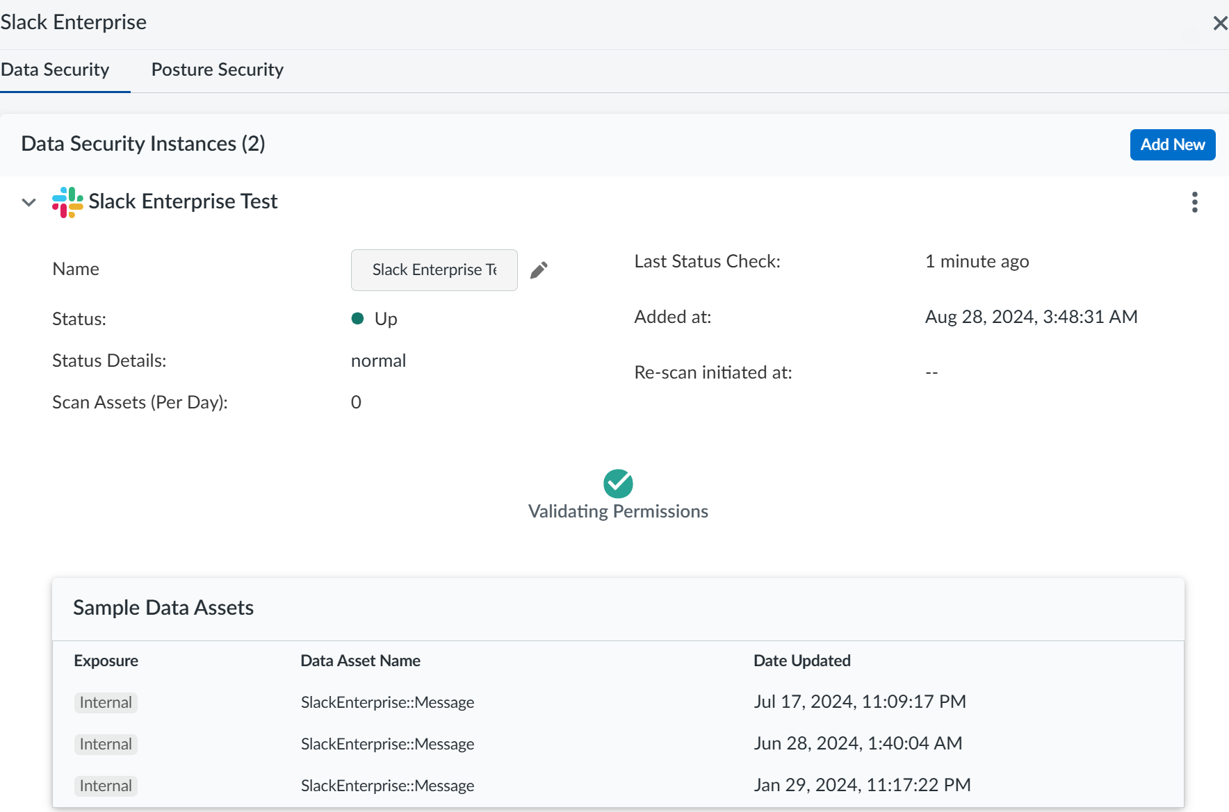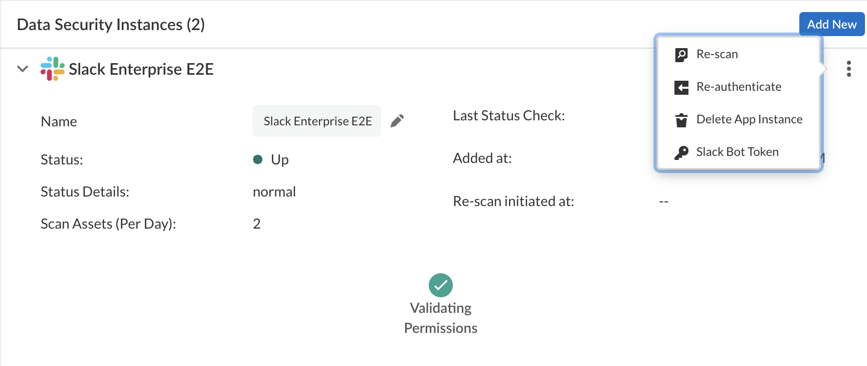 To ensure that your app has onboarded correctly without any issues in authentication or permissions, Data Security performs validation checks between the onboarding and scanning process. You can start scanning only after a successful validation. For Slack Enterprise, the following validation happens:- Validating Permissions