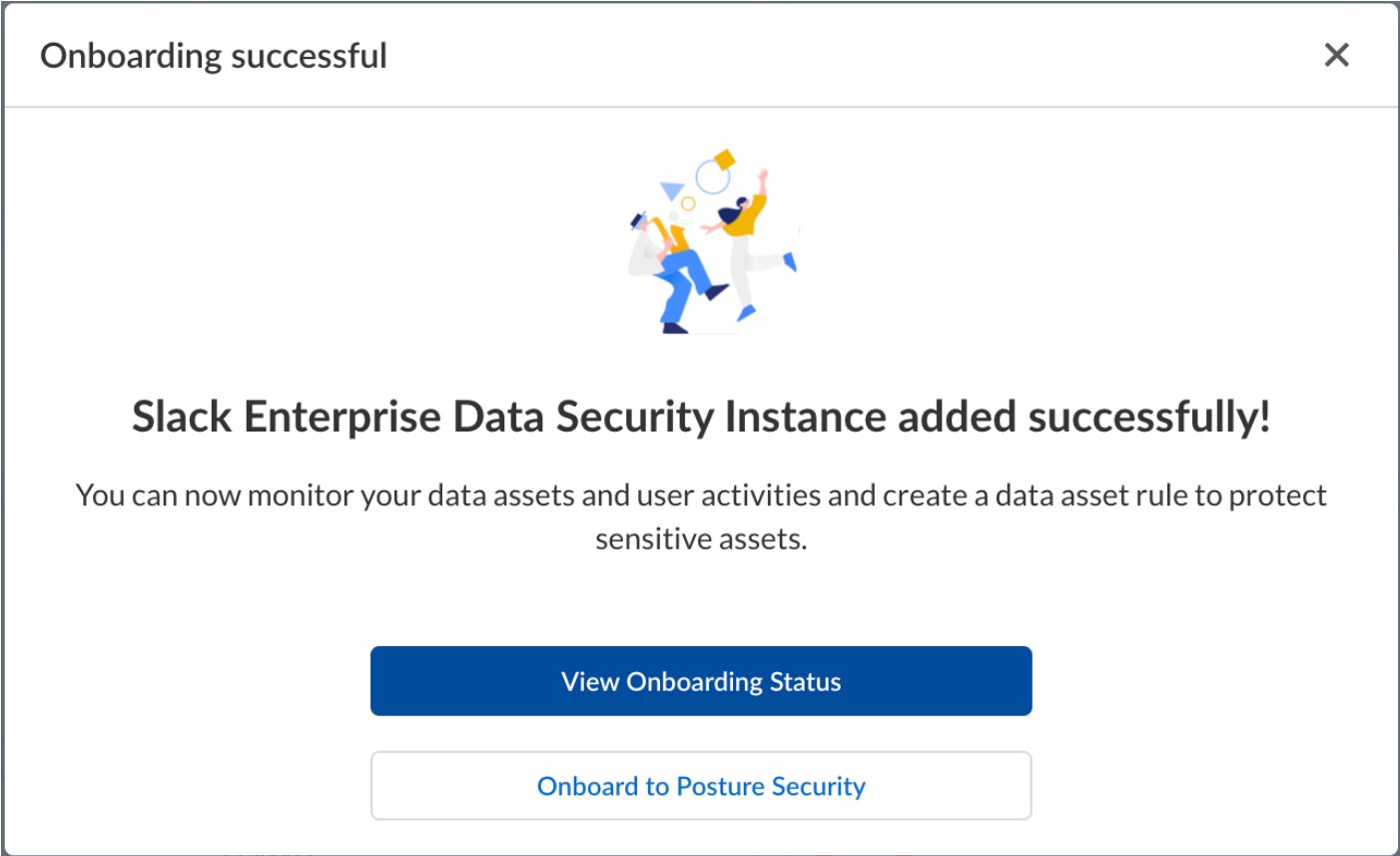 (Optional) Customize your Slack instance.Give a descriptive name to the Slack Enterprise instance to differentiate this instance of Slack Enterprise from other instances.Add policy rules.When you add a cloud app, Data Security automatically scans the app against the default data patterns and displays any match occurrences. As a best practice, consider the business use of your app to determine whether you want to Add a New Data Asset Policy Rule to look for incidents unique to Slack Enterprise.Configure or edit a data pattern.You can Configure Data Patterns to identify specific strings of text, characters, words, or patterns to make it possible to find all instances of text that match a data pattern you specify.Start Scanning Slack Enterprise App.To start scanning the new Slack Enterprise app for risks, select ConfigurationSaaS SecurityData SecurityApplicationsSlack EnterpriseView Settings...Start Scanning.Data Security scans all assets in the associated Slack Enterprise App and identifies incidents. Depending on the number of Slack Enterprise users and assets, it might take some time for Data Security to complete the process. However, you can Monitor Scan Results on the Dashboard and begin to Assess Incidents. Monitoring the progress of the scan during the discovery phase enables you to Fine-Tune Policy rules to modify the match criteria and ensure better results.Troubleshooting Onboarding for Slack Enterprise App