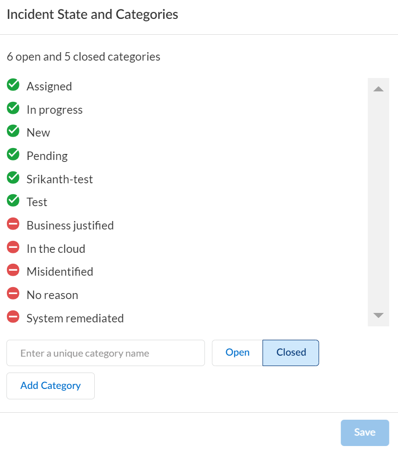 Add custom incident categories on Data Security for Open or Closed states to help filter incidents and track changes.