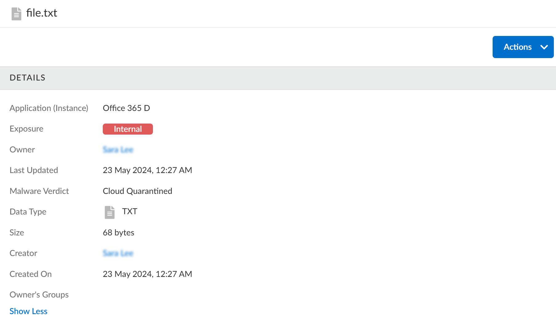 Data Security enables you to track malware scanning for all file types configured for WildFire analysis. When you View Asset Details for such files, Data Security displays a malware scan status. - Log in to Strata Cloud Manager.Select ConfigurationSaaS SecurityData SecurityIncidents.Select the data asset you want to monitor. It is now displayed under the Data Assets tab.Select the asset you want to monitor. Observe the Malware Verdict in the Details pane.