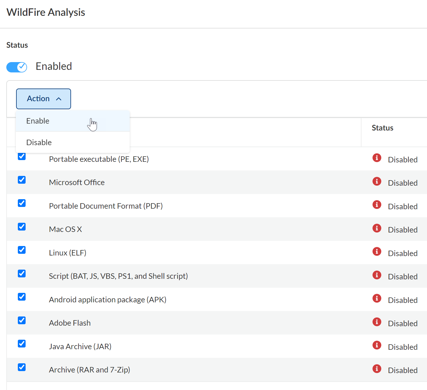 After selecting the files, select ActionEnable.Data Security logs any changes to contextual information in the audit logs. If you want your changes to apply retroactively, initiate a rescan.Next step: Configure Policies for WildFire Analysis.Configure Policies for WildFire Analysis