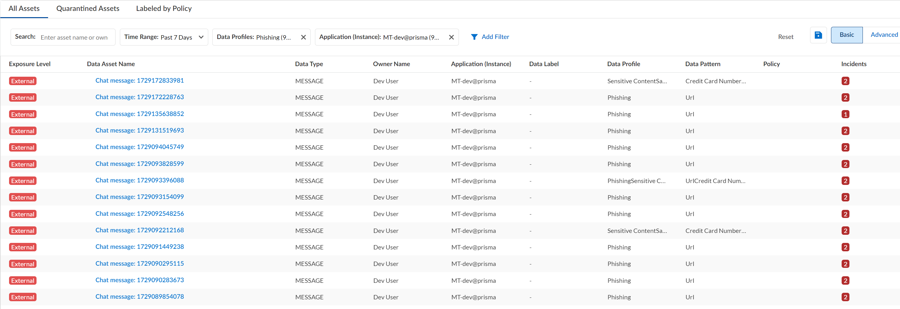 You can view the details of assets scanned for phishing. - Select ConfigurationSaaS SecurityData SecurityData Assets and apply the appropriate filters.In the following example, you can see that the Phishing data profile filter has been applied to display assets related to phishing analysis.