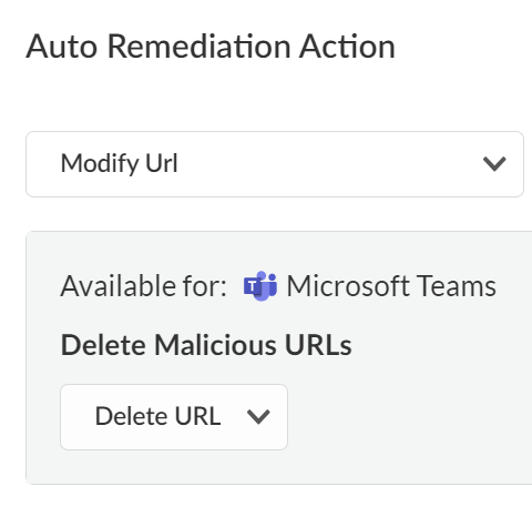 Data Security uses Auto Remediation to delete malicious and phishing URLs automatically. To delete the URLs manually, select ConfigurationSaaS SecurityData Asset NameActionsDelete URL.- If there are two URLs in a chat message, one whitelisted and the other phishing, Data Security performs remediation on the chat message and deletes both the URLs.