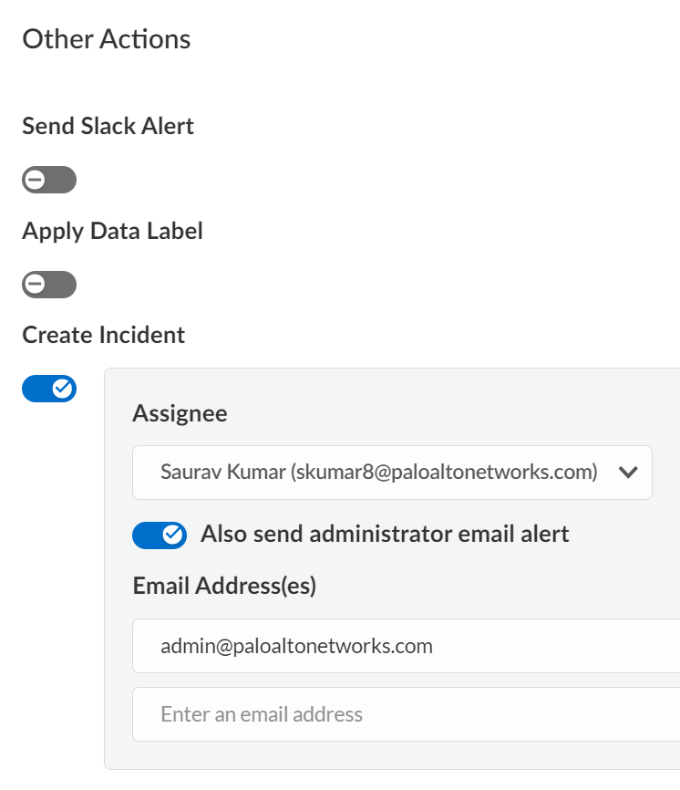 Select Other Actions as required. For example, you can choose to create an incident, assign it to a user, and send an administrator email alert.