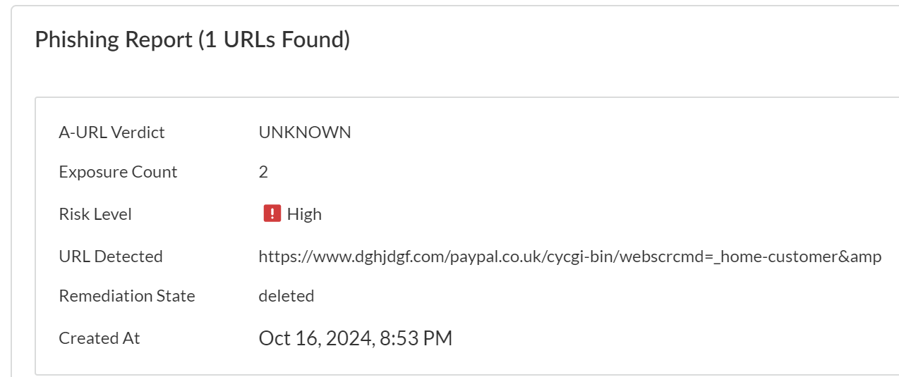 - When a phishing URL is detected, only one remediation action can be performed on the asset—User Quarantine OR Delete URL. Both remediation actions cannot be performed on the same asset.