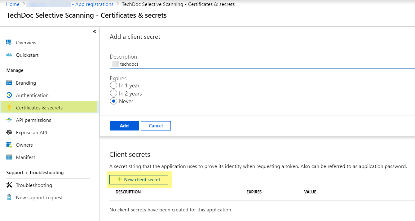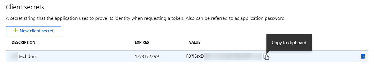 9. Select Certificates & secretsNew client secret, enter a Description, select an expiration, and click Add.