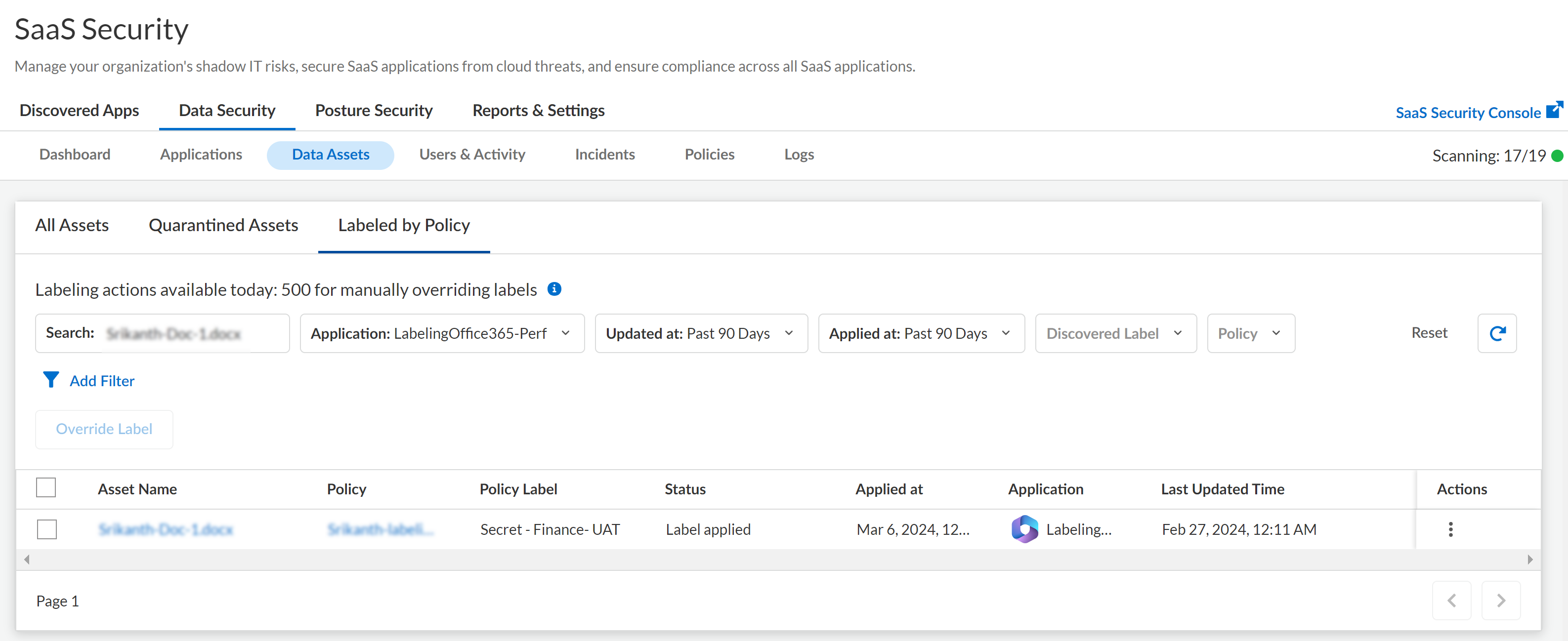 - Select ConfigurationSaaS SecurityData SecurityData AssetsLabeled by Policy. Use the various filters available at the top of the table to filter your results. As an example, the following screen shot shows a specific asset in a specific instance of Office 365.