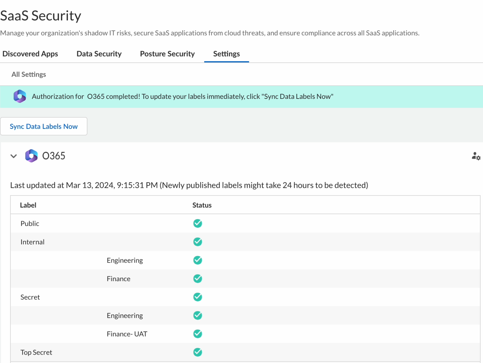 After authorization, the labels are fetched for the Office 365 connector immediately. Labels are refreshed every 24 hours. To fetch labels at any point in time, click Sync Data Labels Now.