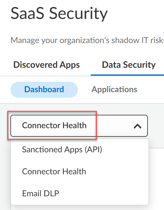 - Select Data SecurityDashboard.Choose Connector Health from the drop-down below the Dashboard tab.