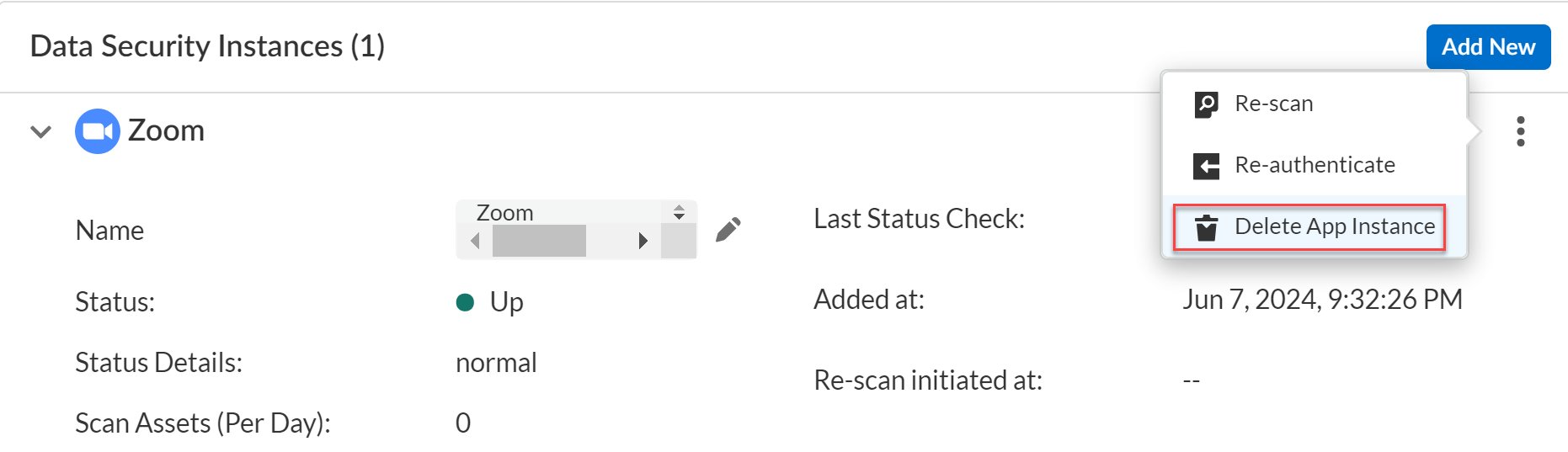 3. Select ConfigurationSaaS SecurityData SecurityApplications<Your Application>View SettingsVertical Ellipses (…)Delete App Instance.
