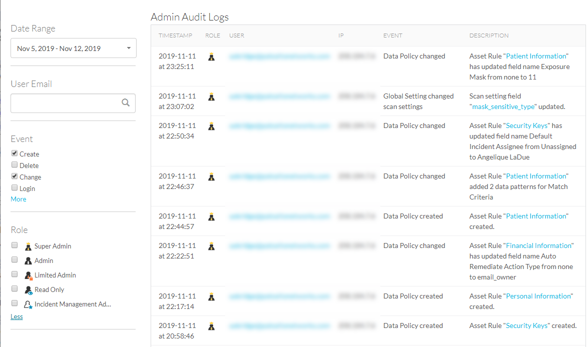- Admin (All Apps)—audit activity and track changes for all administrators.