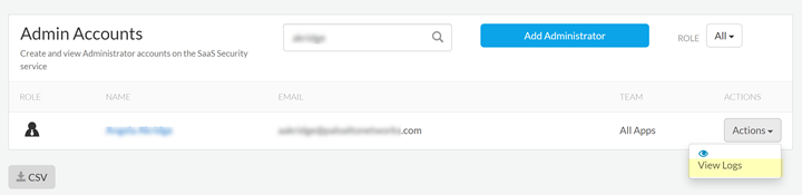 To audit activity for all administrators, ConfigurationSaaS SecuritySettingsMonitor actions taken by SaaS Security administrators.- Use faceted search to narrow the results.(Optional) Export the search results.