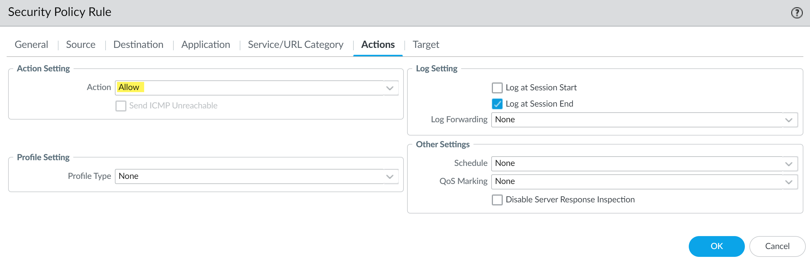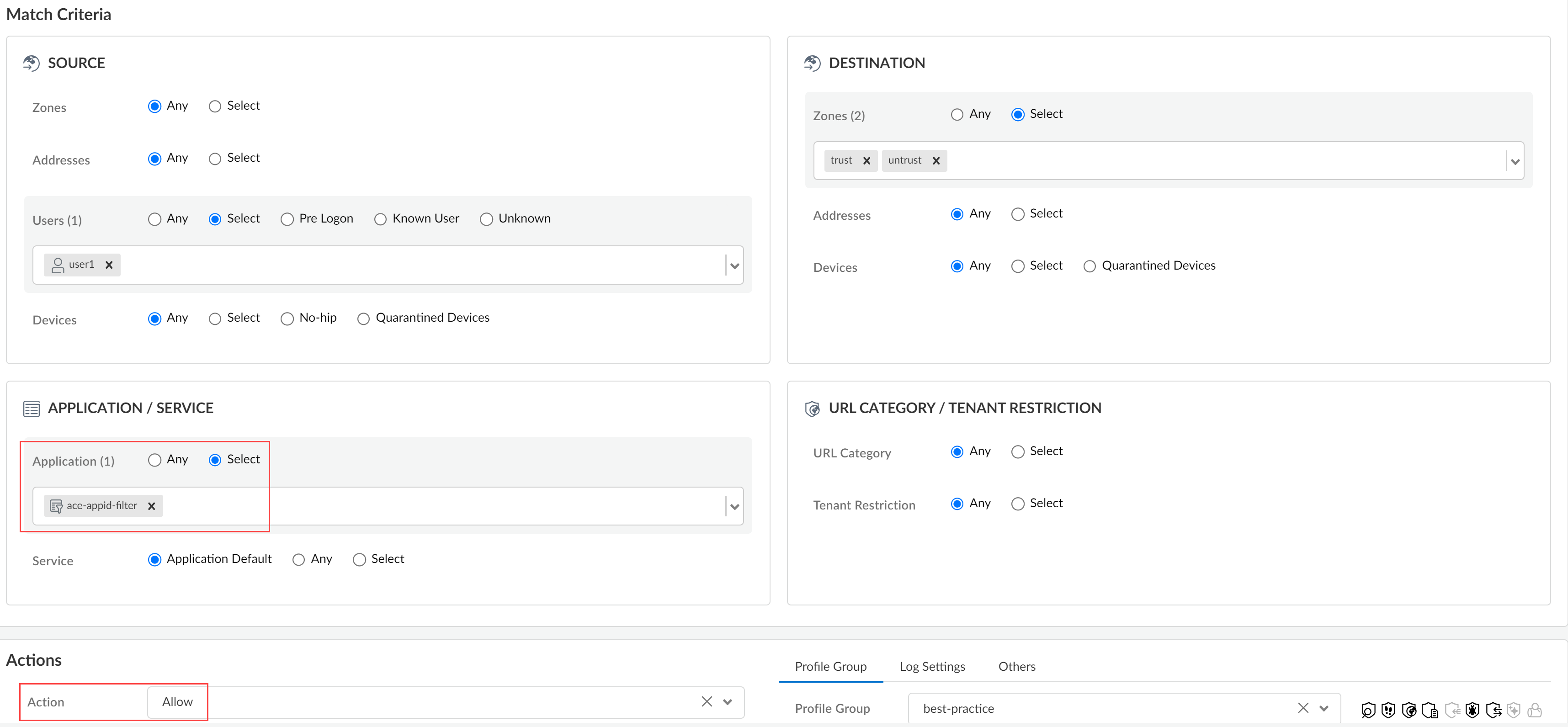 Create a Security policy rule to allow traffic for the same users you allow access to apps with the ssl or web-browsing App-IDs.- Select Security ServicesSecurity Policy and create a new Security policy rule.For this example we named the new Security policy rule ace-appid-allow.Configure the Source and Destination settings to match the existing Security policy rules allowing access to apps with the ssl or web-browsing App-IDs.For the Application in the Application/Service settings, click SelectApplication Filters and select the application filter you created in the previous step.For the Action in the Actions settings, select Allow.Configure the rest of the Security policy rule as needed.Save.