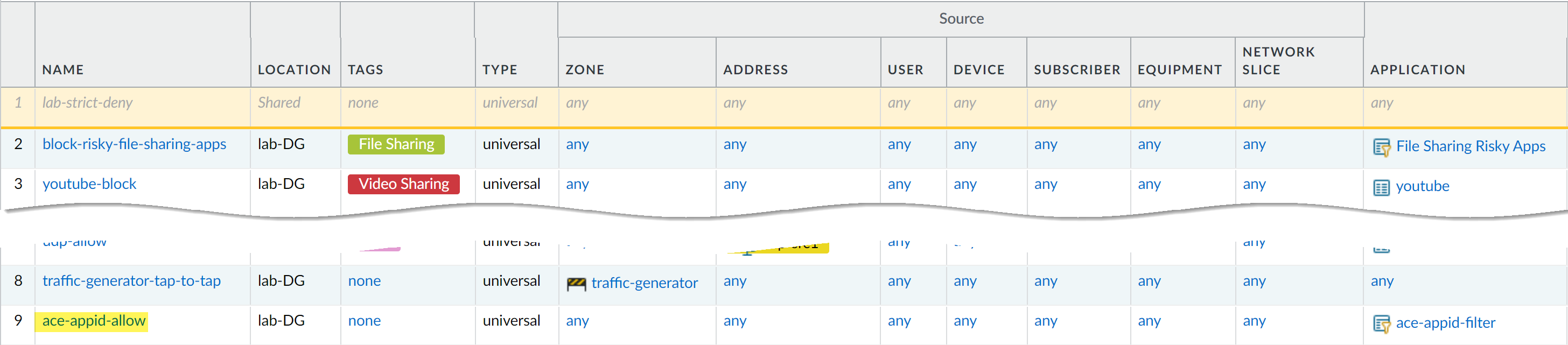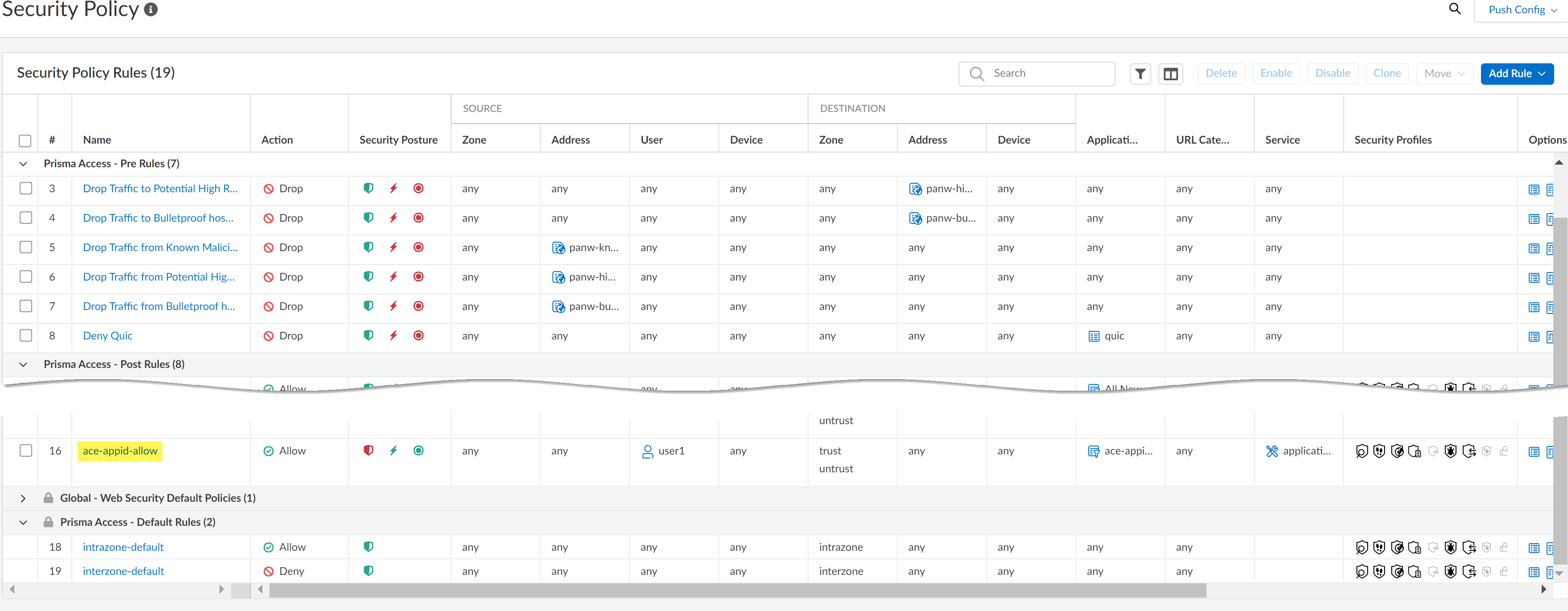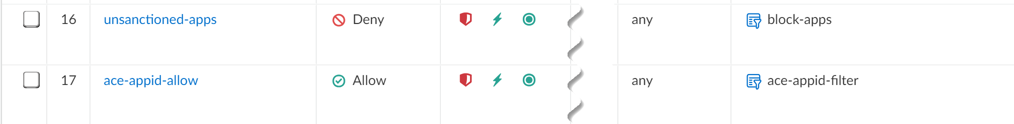 Order the newly created Security policy rule at the bottom of the policy rulebase.By ordering this Security policy rule at the bottom of your Security policy rulebase, you block unsanctioned app traffic before allowing legitimate access to apps with App-IDs delivered through ACE.