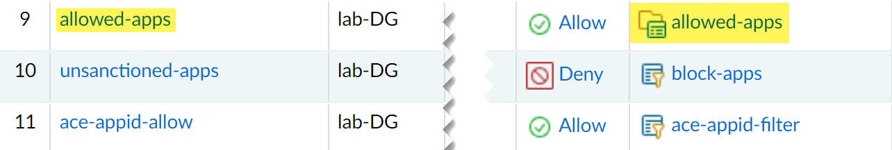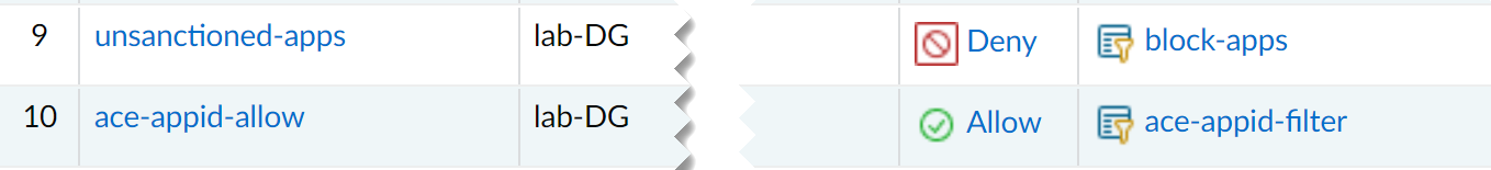 - Contact your Palo Alto Networks representative to generate a SaaS Risk Report and to help you compile a list of ACE App-IDs that match your application filter after you enable ACE.Compiling a list before you enable ACE allows you to understand how many new App-IDs are going to match your existing Security policy rules. By taking proactive steps to identify allowed apps and to create a Security policy rule to explicitly allow them before you enable ACE helps minimize blocked access to allowed apps and unintentional business interruption.Review your Deny Security policy rules and identify all application filters associated with them.Select ObjectsApplicationsApplication Filter and select each application filter to review the lists of impacted apps. Make note of any legitimate apps you want to allow.Generate a SaaS Security Report to see a list of top used apps.Select ObjectsApplicationsApplication Group and create application groups to logically group the apps you want to allow.For this example we named the application group allowed apps.Select Security ServicesSecurity Policy and create a Security policy rule to allow traffic to the application groups you created in the previous step.Alternatively, you can create different Security policy rules for each application group if different users are allowed access to different apps.Order the newly created Security policy rule above your Deny Security policy rules to allow access to those apps.