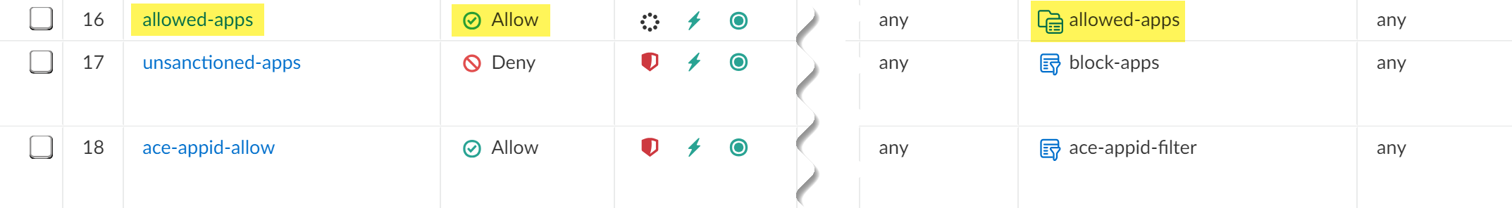 Identify and allow access to allowed apps unintentionally blocked after you enable ACE.In some cases, application filters associated with an existing Security policy rule might unintentionally block traffic to legitimate apps you allow access to after you enable ACE. For example, consider the unsanctioned-apps Security policy rule with the block-apps application filter. Before you enabled ACE this application filter matched 100 apps but after you enabled ACE it matches 1,000 apps. However, of the additional 900 apps there are 10 apps you need to allow. In this case, you need to create a Security policy rule allowing traffic to these apps.