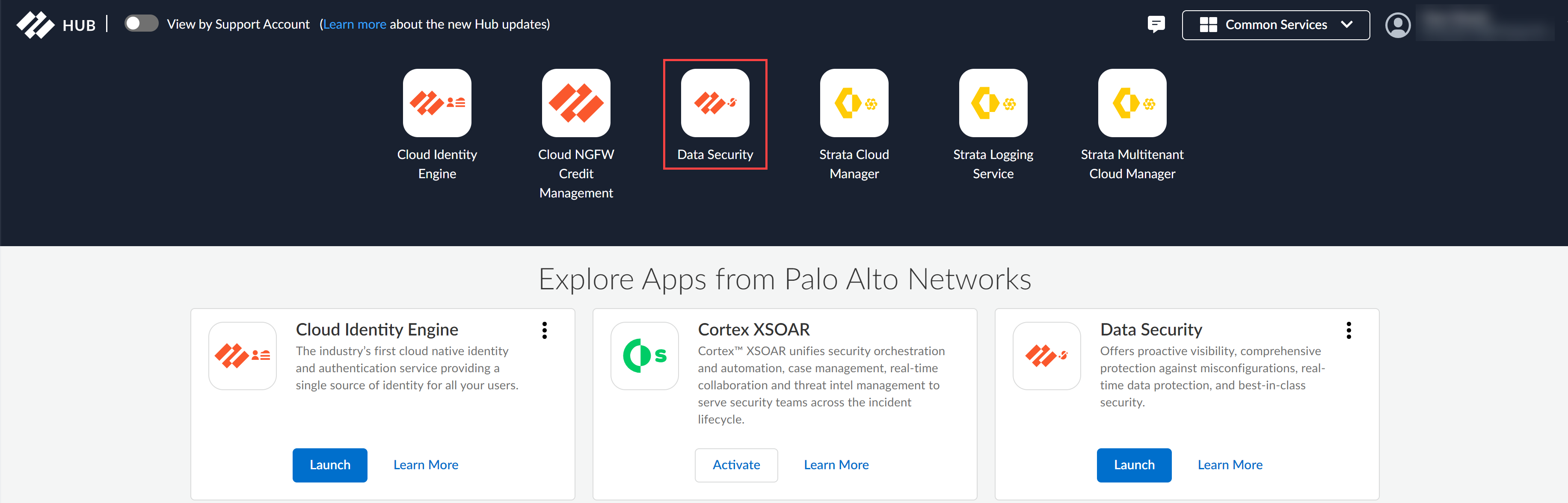 - HubThe Hub now displays a Data Security tile redirecting you to SaaS Security Inline on Strata Cloud Manager.