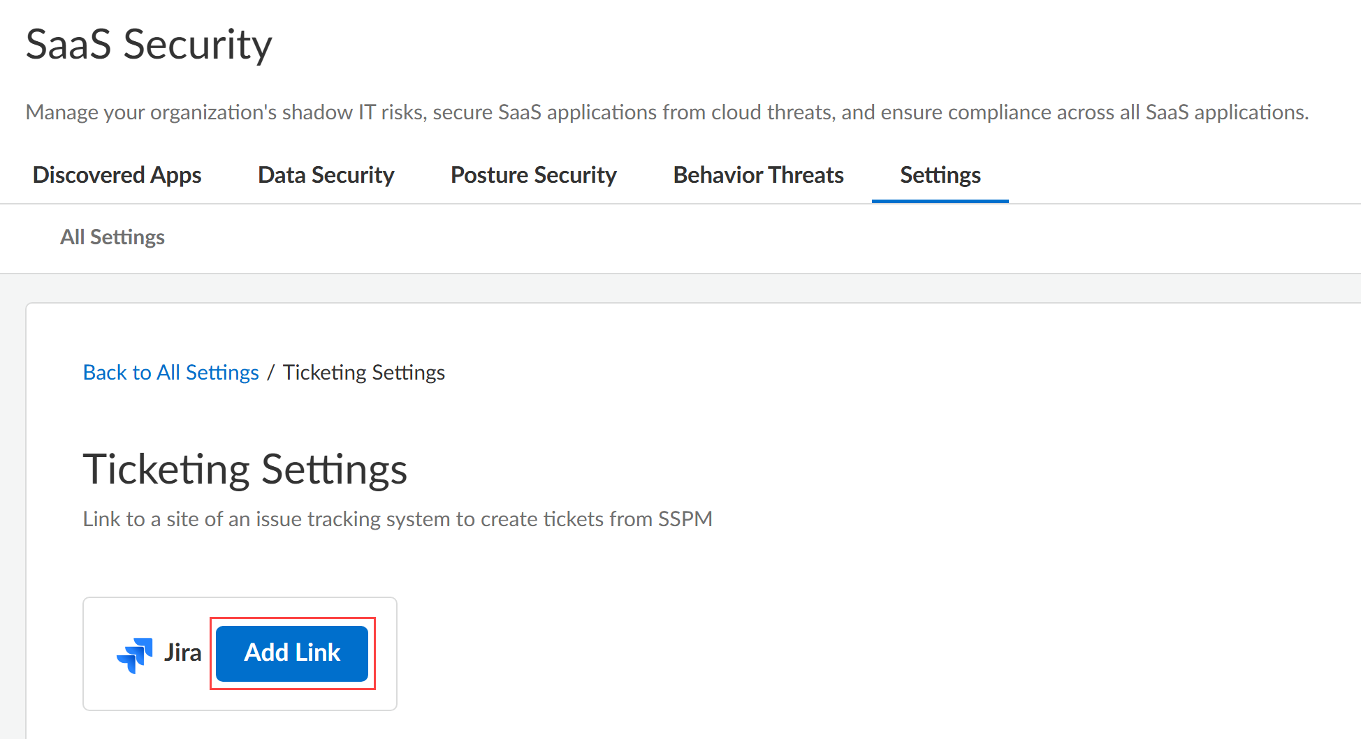 - Log in to Strata Cloud Manager.Select ConfigurationSaaS SecuritySettings WorkflowTicketing Settings.The Ticketing Settings page is displayed.Add Link for Jira.