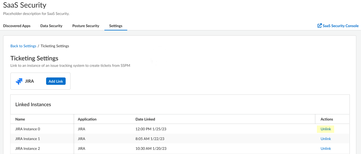 When you no longer need to create tickets in an issue tracking system from SSPM, you can remove SSPM's link to your Jira instance.Linking SSPM to an issue tracking system (Jira or ServiceNow) enables you to create tickets in the issue tracking system directly from SSPM. When you no longer need this capability, you can unlink SSPM from the issue tracking system. For example, you might want to unlink a Jira instance because you are no longer using the Jira instance to manage your team's tasks.Unlinking an instance of Jira or ServiceNow also unlinks all tickets that were created in the issue tracking system from SSPM. Unlinking the tickets does not delete the tickets from the issue tracking system.- Log in to Strata Cloud Manager.Select ConfigurationSaaS SecuritySettings Workflow Ticketing Settings.The Ticketing Settings page is displayed. This page lists the links that exist between SSPM and instances of Jira and ServiceNow.In the Linked Instances area, locate the instance of Jira or ServiceNow and Unlink the instance.