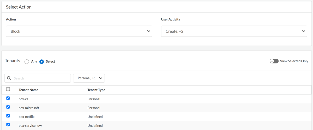 control. You can select up to 30 tenants.When the Allow action is supported for an app, you can specify that the policy recommendation applies to Any tenant. The Any specification acts as a wildcard to match all current and future tenants. On the NGFW, when an imported policy specifies Any tenant, the policy will apply to all tenants unless an earlier policy in the NGFW's evaluation order specifies a different action for a tenant. In this way, you can define one policy recommendation to Allow the actions for selected tenants and another to Block the actions for Any other tenants.To filter the list of tenants, select a Tenant Type.