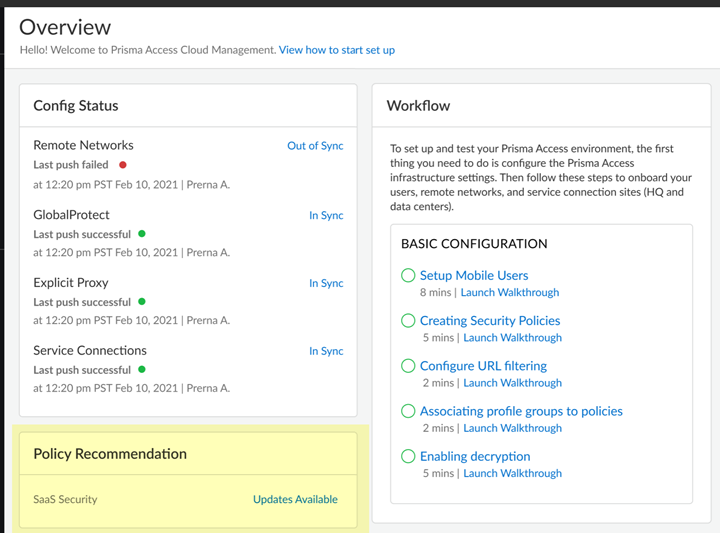 Learn how to update imported SaaS policy rule recommendations on Strata Cloud Manager.You can monitor the availability of updates to rule recommendations from OverviewPolicy Recommendations.
