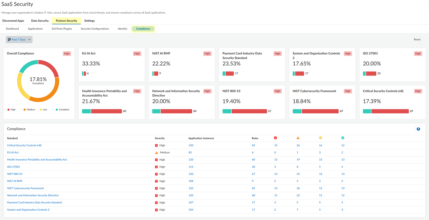- Log in to Strata Cloud Manager.Select ConfigurationSaaS SecurityPosture Security Compliance.Review the SSPM Compliance dashboard.The Compliance dashboard displays the overall compliance of SaaS apps that SSPM is monitoring, and the number of rules for each compliance standard that passed and failed. The dashboard table includes more details, such as the number of app instances with settings related to the compliance standard.To export a CSV file that contains the information in the table, click the table's download icon. SSPM will send a download link to your email address.