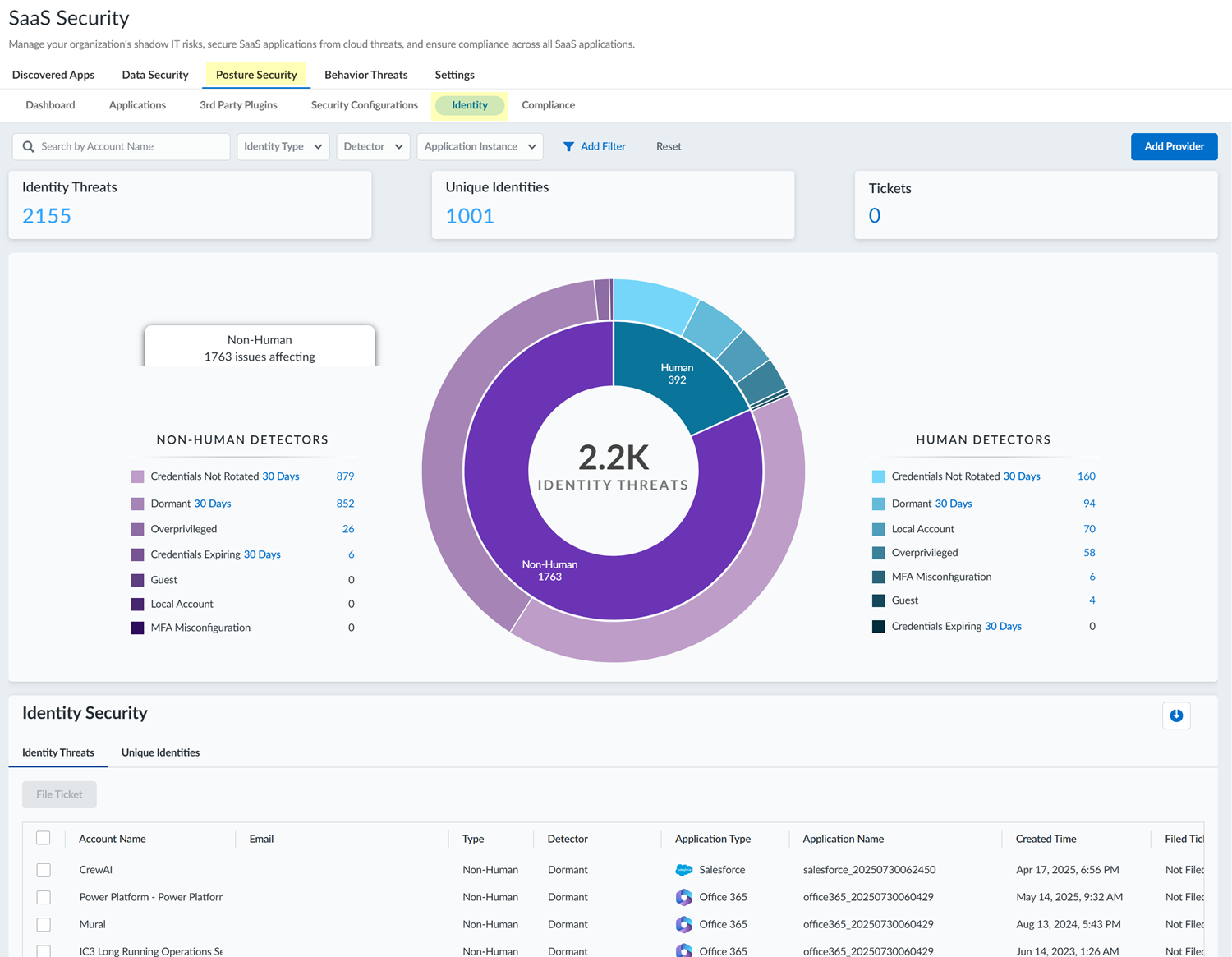 SaaS Security Posture Management includes an Identity component for identifying threats to your identity posture. You can navigate to the Identity page in SSPM to examine these threats. The Identity page provides an overview of identity-related threats across SaaS apps used in your organization. From here, you have a unified view of human and non-human identities in your organization and the threats related to those identities. By giving you visibility into these threats, the Identity page enables to you to address areas of concern and close security gaps.