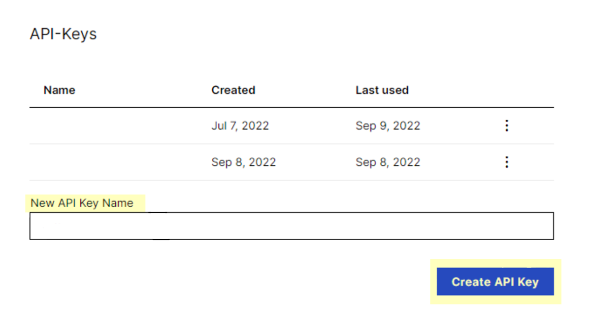 3. On the Edit Profile page, locate the API-Keys section. Enter a New API Key Name and Create API Key.
