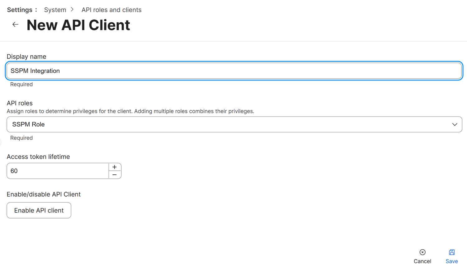 - Specify a Display name for the API role. This name will appear in the list of API clients on the API Roles and Clients page. To distinguish it for other API clients in the list, specify a meaningful name. For example, SSPM Integration.