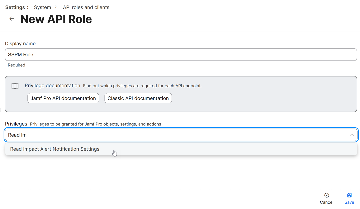 - Specify a Display name for the API role. This name will appear in the list of API roles on the API Roles and Clients page. When you're creating the API client, this name will also appear in a selection list for assigning a role to the API client. For these reasons, specify a meaningful name, such as SSPM Role.