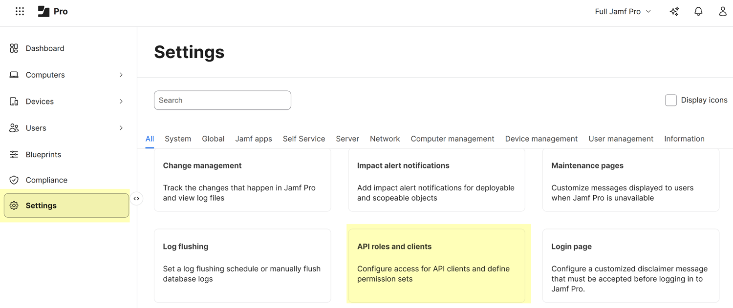 - In Jamf Pro, navigate to the Settings page. To do this, from the left navigation pane select Settings.