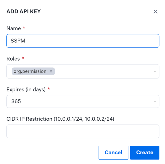 - Copy the API key and paste it into a text file.Do not continue to the next step unless you have copied the API Key. You must provide this key to SSPM during the onboarding process.